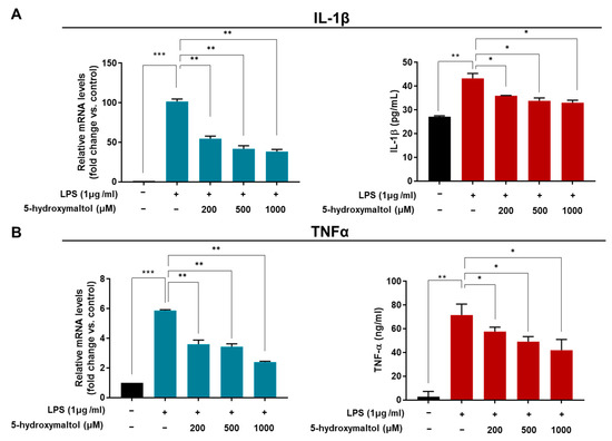 3.4. 5-Hydroxymaltol Suppressed the LPS-Stimulated TNF-α and IL-1β Production and mRNA Level in RAW 264.7 Cells