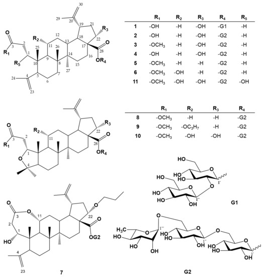 - Shirasuna, K.; Miyakoshi, M.; Mimoto, S.; Isoda, S.; Satoh, Y.; Hirai, Y.; Ida, Y.; Shoji, J. Lupane triterpenoid glycosyl esters from leaves of Acanthopanax divaricatus. Phytochemistry 1997, 45, 579–584. [Google Scholar] [CrossRef]