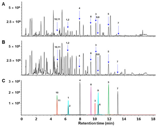 Representative negative ion mode mass chromatogram of (A) ASFEx, (B) AFB, and (C) isolated compounds (1–11) based on a UPLC(ESI)-QTOF-MS.