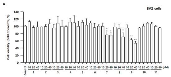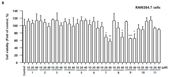 To examine whether compounds 1–11 have cell toxicity, the 3-(4,5-dimethylthiazol-2-yl)-2,5-diphenyltetrazolium bromide assay was conducted in BV2 and RAW264.7 cells. The cells were incubated for 48 h with various concentrations of compounds 1–11. The cell viability did not alter following the addition of 40 μM concentrations of compounds 1–6, 10, and 11 for 48 h; however, compound 7 at 20 μM, Compound 8 at 40 μM, and compound 9 at 20 μM demonstrated cell toxicity in BV2 and RAW264.7 cells. Therefore, adequate concentrations of compounds 1–11 in subsequent experiments were determined based on the results of Figure 3.