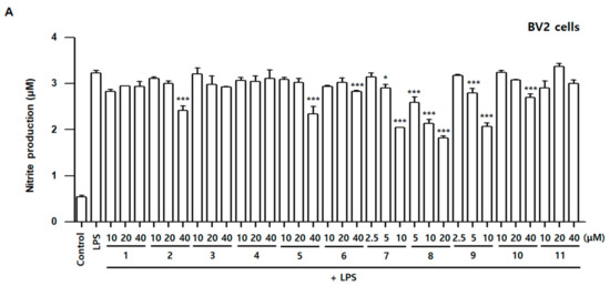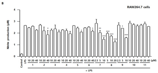 Effects of Compounds 1–11 on nitrite contents in LPS-stimulated BV2 (A) and RAW264.7 (B) cells. Cells were pretreated for 3 h with indicated concentrations of compounds 1–11 and stimulated for 24 h with LPS (1 μg/mL). Nitrite concentration was performed as described in Materials and Methods. Bars represent means ± standard deviation of three independent experiments. * p < 0.05, ** p < 0.01, *** p < 0.001 compared with the LPS-treated group.