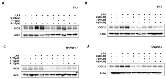 Inflammatory cytokines and mediators are rapidly increased after macrophages and microglia are activated. The expression of pro-inflammatory proteins can also be increased. In BV2 and RAW264.7 cells, LPS induces NO production through activating iNOS expression. LPS also increases COX-2 expression, which mediates the synthesis of prostaglandins and cytokines. NO or prostaglandins regulate various biological functions of immune responses [27]. Therefore, we assessed iNOS and COX-2 expression in BV2 and RAW264.7 cells that affect the production of inflammatory mediators and cytokines, respectively. Cells were pretreated for 3 h with indicated concentrations of compounds 7–9 and stimulated for 24 h with LPS. The LPS-induced expression of iNOS and COX-2 in both types of cells was significantly inhibited by compounds 7–9 (Figure 6). In this result, compounds 7–9 significantly regulated iNOS and COX-2 protein expression, suggesting that it exhibits inhibitory effects on inflammatory mediators and cytokines.
