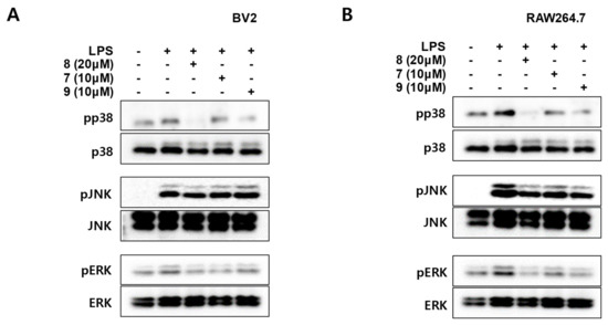 Effects of compounds 7–9 on p38, JNK-1/2, and ERK-1/2 phosphorylation in BV2 (A) and RAW264.7 (B) cells. Cells were pretreated with indicated concentrations of compounds 7–9 for 3 h and stimulated for 30 min with LPS (1 μg/mL). Cell extracts were analyzed using Western blotting with antibodies specific for phosphorylated p-p38, p-JNK1/2, and p-ERK1/2. Membranes were stripped and re-probed to measure total abundance of each mitogen-activated protein kinase (MAPK) as a control measurement. Representative blots from three independent experiments are shown.