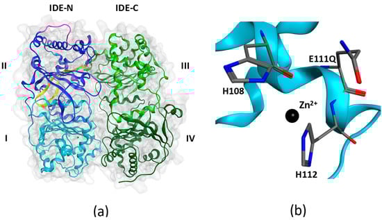 X-ray structure of insulin-degrading enzyme in its closed conformational state (PDB: 4PES). (a) IDE is composed of an N-terminal half (IDE-N) containing domains I and II, and a C-terminal half (IDE-C) containing domains III and IV. The two halves are joined by an unstructured linker (magenta). Domain I contains the HXXEH zinc-binding and catalytic motif. Domain II contains the exosite (yellow) in an anti-parallel β-sheet conformation. (b) The HXXEH motif includes H108 and H112 that coordinate Zn2+ and the catalytically important glutamate (E111) residue. When E111 is mutated to a glutamine as in 4PES, the enzyme becomes inactive.