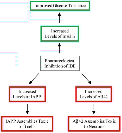 Given IDE’s ability to degrade insulin, IAPP and Aβ42, it is no surprise that there has been strong academic and pharmaceutical interest in developing small molecules that modulate IDE’s activity [9,10,11,12]. Several small-molecule and peptidic IDE inhibitors have been developed and investigated for their effects on insulin levels in cells or mice. Ii1 [13] and P12-3A [14] inhibited degradation of extracellular insulin in cells and fibroblasts, respectively. BDM44768 [15], B35 [16], and 6bk [17] elevated plasma insulin levels in mice. Despite these advances, significant challenges remain, as noted in a recent review by Leissring et al. [12]. First and foremost, inhibiting IDE may lead to increased levels of IAPP and Aβ, increasing the risk for T2D and AD, respectively (Figure 2).