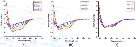 Figure 4 presents the CD spectra of insulin IDE digests in the absence of polyphenols and in the presence of EGCG or resveratrol. The time-dependent spectra recorded in the absence of polyphenols (Figure 4a) were similar to those we reported recently [26]. The intensities of the signals at 222 and 208 nm decreased with time, indicating the progressive loss of α-helical insulin. Similar results were obtained in the digestions that contained resveratrol (Figure 4b), which suggest that the polyphenol has no effect on the IDE-dependent degradation of insulin. In sharp contrast, insulin’s CD helical signals persisted in the presence of EGCG (Figure 4c), indicating inhibition of the proteolysis of insulin by IDE. We noted, however, that the intensities of the helical signals, particularly at 222 and 198 nm, decreased, suggesting that the inhibition is partial and not complete.