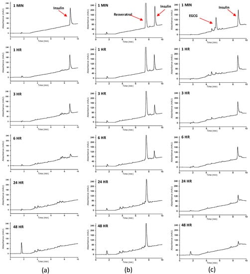 We also used reversed phase HPLC to monitor the proteolytic activity of IDE toward insulin over the same incubation periods used in the digestions that yielded the CD spectra shown in Figure 4. Representative chromatograms of control samples are shown in Figure 5a. As the digestion time increased, the intensity of the insulin peak decreased and peaks at shorter retention times appeared due to the production of insulin fragments. Digestion is complete within 24 h. Figure 5b presents chromatograms of the digests in the presence of resveratrol. With the exception of the peak for resveratrol, the chromatograms were similar to those of the control samples. Insulin degradation was also complete within 24 h. Figure 5c shows the chromatograms of the digests in the presence of EGCG. In contrast to the corresponding chromatograms in Figure 5a,b, the chromatograms of the 24- and 48-h digests showed the presence of the insulin peak indicating inhibition of IDE-dependent degradation. The intensity of the insulin peak, however, decreased with time, suggesting that the inhibition of IDE was not complete. The intensity of the peak for EGCG decreased with incubation time, presumably because it epimerizes to gallocatechin-3-gallate and/or dimerizes to form digallate dimers [22,33]. Our cumulative CD (Figure 4) and RP HPLC (Figure 5) results clearly demonstrate that resveratrol has no effect on IDE’s activity toward insulin. EGCG, on the other hand, partially inhibits IDE.