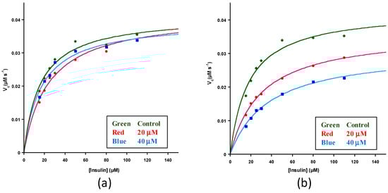where [DI]t is the amount of digested insulin at real-time t; [I]0 is the initial amount of undigested insulin; and [θobs(222nm)]t and [θobs(222nm)]0 are the observed ellipticity at real-time t and observed initial ellipticity at time = 0, respectively. Plots of [DI] against time were used to determine the initial rates (V0) of insulin proteolysis by IDE. Michaelis–Menten (V0 plotted against [S], Lineweaver–Burk (1/V0 plotted against 1/[S]), and Hanes–Woolf ([S]/V0 plotted against [S]) plots were then constructed from which the kinetic constants KM, Vmax, kcat and kcat/KM were determined.