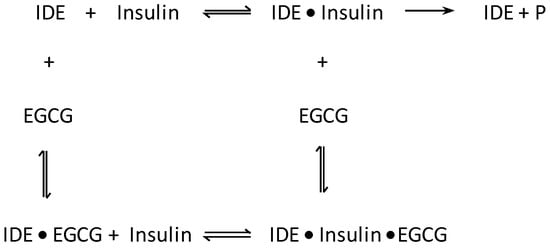 Schematic representation of the mixed inhibition of IDE-dependent degradation of insulin by EGCG. EGCG binds to either IDE or IDE●insulin complex, leading to a decrease in catalytic activity.