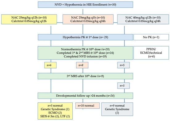 We enrolled 30 neonates with moderate to severe HIE receiving hypothermia in this Institutional Review Board (IRB)-approved open-label, early phase study (NCT 04643821). We administered intravenous (iv) NAC and calcitriol (NVD) daily for 10 days. We obtained blood samples for NVD PK estimates and oxidative stress markers around the first dose and during 72 h of hypothermia (HT) and around the 10th–11th dose on DOL 5–6 during subsequent normothermia (NT). We paired plasma PK and oxidative stress samples around the 10th or 11th doses with MRS before and after NVD infusion on DOL 5–6, to determine CNS PD dose response in [GSH] and duration of the CNS effect. We were powered to detect 20% [GSH] change of NVD with 20 paired MRS datasets. Our primary safety outcomes were hypotension (NAC) and hypercalcemia (calcitriol). MRS quantification was blinded to dose and condition.
