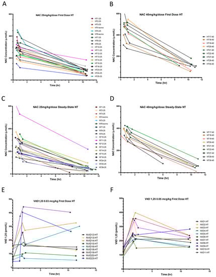 Plasma NAC and serum 1,25(OH)2D concentrations and pharmacokinetics. (A,B) Plasma NAC concentrations during hypothermia (HT) and (C,D) normothermia (NT), with NAC (A,C) 25 mg/kg/dose and (B,D) 40 mg/kg/dose. (E,F) 1,25(OH)2D serum concentrations during HT with calcitriol (E) 0.03 mcg/kg/dose, (F) 0.05 mcg/kg/dose.