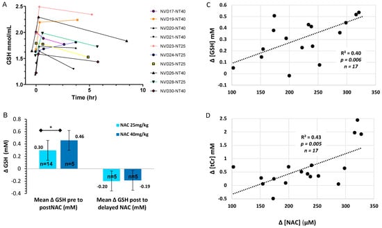 CNS GSH changes over time and by NAC dose. (A) [GSH] in BG of the 10 HIE infants with serial MRS on DOL 5–6 immediately before (trough = 0 h), and after NVD (peak = 12–30 min) and delayed (post-peak = 2–6 h), with NAC alone (n = 5) or NVD infusion (n = 5). (B) [GSH] change with NAC 25 mg/kg/dose or 40 mg/kg/dose from trough to peak [GSH] or peak to post-peak (2–6 h) after NAC/NVD infusion (* p < 0.05). We included all patients who had the entire dose reliably delivered prior to second scan (efficacy analysis). (C,D) Trough to peak increase in plasma [NAC] plotted with the simultaneous increase in basal ganglia metabolites (C) [GSH] and (D) [tCR] for the 17 subjects with adequate MRS and [NAC] plasma data.
