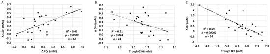 NAC plasma concentrations strongly correlated with the simultaneous increase in CNS [GSH] and [tCr] from trough to peak, before and after the NVD infusion (Figure 3C,D). The absolute change in [ΔGSH] also positively correlated with the absolute change in [ΔtCr] from trough to peak (Figure 4A), demonstrating that CNS energetics improved in conjunction with antioxidant concentrations. Moreover, the lower the baseline [GSH] and [tCr] before dosing (trough), the greater the increase with NAC/NVD (Figure 4B,C). Conversely, the higher the trough [GSH] and [tCr] in BG before NAC/NVD, the less the absolute increase in [GSH] and [tCr].