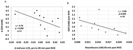 Plasma oxidative stress markers Isofurans and Neurofurans correlate with CNS [GSH] after NVD. (A) The increase in [GSH] is strongly correlated with a decrease in Isofurans from pre to post NVD dosing. (B) [GSH] after NVD infusion is strongly negatively correlated with Neurofurans at 60 min post infusion. (Spearman’s rank correlation).