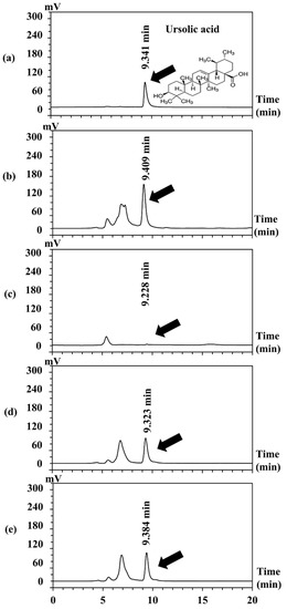 2.4. Determination of Ursolic Acid Content by High Performance Liquid Chromatography (HPLC)