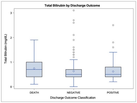 Boxplots of total bilirubin levels observed in “Death” (n = 61), “Negative” (n = 136), and “Positive” (n = 80) discharge outcome groups (p = 0.036). Mean values are represented as white diamonds; outliers are represented as white circles.