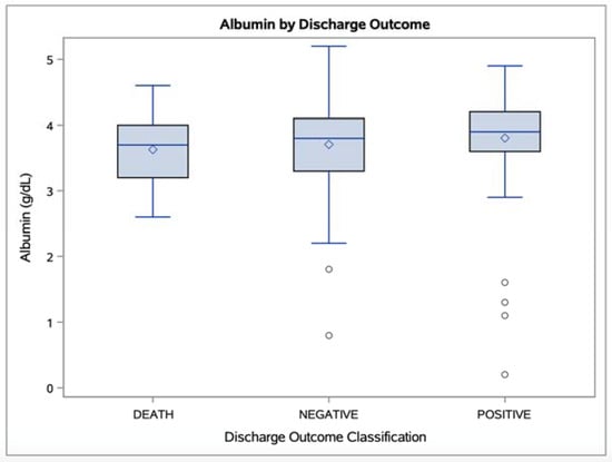 Boxplots of albumin levels observed in “Death” (n = 61), “Negative” (n = 136), and “Positive” (n = 80) discharge outcome groups (p = 0.016). Mean values are represented as white diamonds; outliers are represented as white circles.