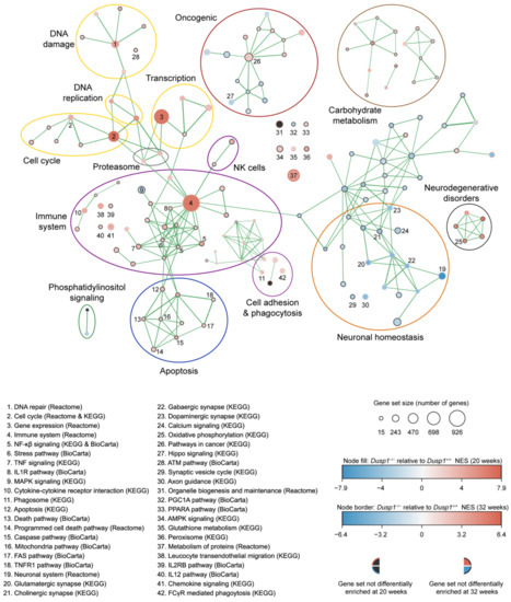Gene-set enrichment analysis of RNAseq data sets from 20- and 32-week-old Dusp1+/+ and Dusp1−/− cochlea. Enrichment analysis visualization for identification of altered gene sets (nodes). Gene sets derive from Reactome, KEGG and BioCarta databases. Node size denotes gene set number. Differentially enriched gene sets in 20-week-old Dusp1−/− mice are designated by node fill while node border designates 32-week-old data. Normalized enrichment value (NES) for each time point is illustrated in a color scale from blue (negative enrichment) to red (positive enrichment). No representation of the gene set at either time point is shown by a grey node fill or grey border, respectively. Connection between nodes is represented by lines. Line width symbolizes number of genes shared by both nodes. Most interesting nodes are numbered and listed (1–42). Related nodes are grouped in modules and labeled accordingly. Related modules share the same color.