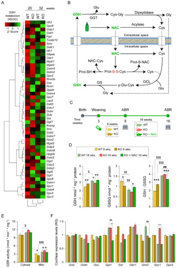 Impact of N-acetylcysteine administration for glutathione metabolism. (A) Glutathione (GSH) metabolism (KEGG database) heatmap generated from differential expression data derived from RNAseq. (B) Scheme illustrating GSH biosynthesis, extracellular recycling and N-acetylcysteine (NAC) antioxidant power. GSH and NAC appear in green; glutathione synthesis and recycling enzymes appear in black capital letters: GCL (glutamate-cysteine ligase), GS (glutathione synthetase), GGT (gamma glutamyl transferase); glutathione precursors: Cys (cysteine), Glu (glutamate) and Gly (glycine); oxidized protein disulfide bonds in red (S-S). (C) Experimental design illustrating the start and end-time points of NAC administration (weaning-16 weeks), hearing evaluation (auditory brainstem response [ABR]) testing time points (8 and 16 weeks), experimental groups and sampling time points. (D) GSH, glutathione disulfide (GSSG) levels and GSH:GSSG ratio from pooled samples of 2 inner ears of 8- and 16-week-old wild-type (WT), Dusp1 knock-out (KO) and NAC-treated Dusp1 KO mice. All measurements were performed in triplicate. GSH and GSSG values are presented relative to milligram of protein. (E) GSR (glutathione reductase) activity in cytosolic and mitochondrial fractions from pooled samples of 2 inner ears per condition. Measurements were performed in triplicate, and values are presented relative to milligram of protein. (F) RT-qPCR gene expression levels of GSH-related enzymes from whole cochlea pooled samples from 3 mice per condition. Expression levels were calculated as 2−ΔΔCt (RQ) from triplicate measurements using Hprt1 as a reference gene and normalized to levels in 8-week-old WT mice. All data are presented as mean ± SEM. Statistical significance between genotypes and time points was analyzed by one-way ANOVA: * vs. KO, # vs. WT, $ 8-week-old mice vs. 16-week-old mice (*, $ p < 0.05; **, ##, $$ p < 0.01; ***, $$$ p < 0.001).