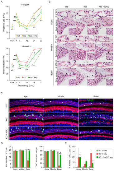For drug administration, we used the protocol of a previous study [23], with some modifications. Briefly, fresh NAC was prepared every week at a dose of 10 g/L in drinking water (pH ~ 7.4) and was administered for 13 weeks, beginning treatment at weaning (week 4) up to 4 months of age (week 16). Animals were maintained under controlled temperature and light–dark cycle conditions and received standard chow diet and water ad libitum. To assess the impact of antioxidant treatment on auditory function, hearing thresholds were evaluated by the auditory brainstem response (ABR) at the end of weeks 8 and 16. WT and KO mice were sacrificed, and samples were collected at both time points, whilst KO + NAC only at the second time point.