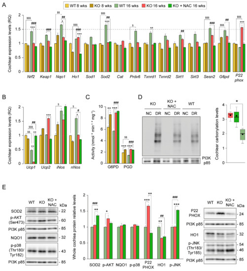 Impact of N-acetylcysteine administration for cochlear redox homeostasis. (A,B) RT-qPCR gene expression levels of redox enzymes from whole cochlea pooled samples from 3 mice per condition. Expression levels were calculated as 2−ΔΔCt (RQ) from triplicate measurements using Hprt1 as a reference gene and normalized to levels in 8-week-old wild-type (WT) mice. Data are presented as mean ± SEM. (C) Glucose-6-phosphate dehydrogenase (G6PD) and 6-phosphogluconate dehydrogenase (PGD) activity from pooled inner ear cytosolic fractions of two mice per condition. Measurements were performed in triplicate, and values are presented relative to milligram of protein. Data are presented as mean ± SEM. (D) Cochlear oxidative protein carbonylation levels of pooled cochlear protein extracts from 3 mice per condition analyzed with the Oxyblot™ Kit. Derivatized protein extracts (DR) are shown together with non-derivatized extracts (NC) in the representative blot image. Quantification was performed in triplicate, and levels were referred to those of PI3K. Data are presented as a box plot, mean value is plotted as a filled circle and whiskers represent min and max values. (E) Western blotting of pooled cochlear protein extracts from 3 mice per condition. All protein levels are referred to those of PI3K and normalized to data from 16-week-old WT mice. Data are presented as mean ± SEM. Statistical significance between genotypes and time points was analyzed by one-way ANOVA: * vs. KO, # vs. WT, $ 8-week-old mice vs. 16-week-old mice (*, #, $ p < 0.05; **, ##, $$ p < 0.01; ***, ###, $$$ p < 0.001).
