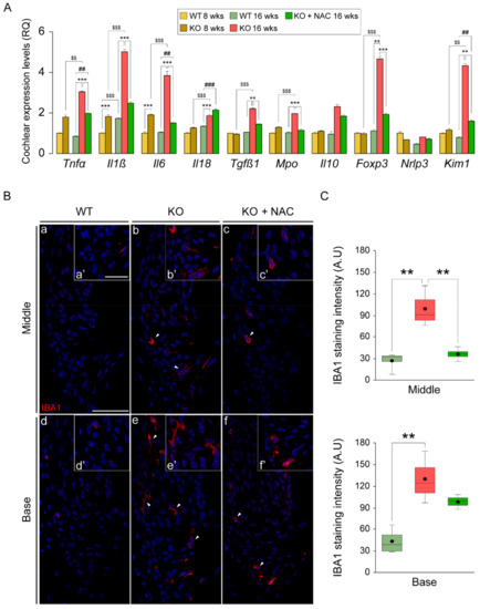 Chronic inflammation is a common feature of aberrant ROS production, which stimulates the inflammatory response in a positive feedback loop to ultimately disrupt cell and tissue homeostasis. In this context, DUSP1 is a key regulator of cell fate in response to oxidative and inflammatory stimuli. To further understand how loss of Dusp1 impacts the regulation of these two pathways, we studied the production of inflammatory mediators in the 3 groups of mice (Figure 6A). Gene expression analysis of cochleae revealed a marked induction of proinflammatory cytokine gene expression of Tnfα, Il1β, Il6 and Il18 in Dusp1−/− mice from 8 to 16 weeks. Even at the earlier age tested, cytokine expression levels were higher in Dusp1−/− mice than in Dusp1+/+ mice with the exception of Il18. Il1β expression also increased from 8 to 16 weeks in Dusp1+/+ mice, albeit to a much lesser extent. Of note, cytokine expression levels were similar between NAC-treated Dusp1−/− mice and Dusp1+/+ mice, indicating that NAC blunts the inflammatory response. A similar NAC response was observed for the expression levels of Tgfβ1, Mpo, Foxp3 and Kim1. Overall, these results suggest that the induction of inflammatory gene expression observed in Dusp1−/− cochleae was secondary to the oxidative imbalance, as it could be repressed, albeit incompletely, with NAC. To further confirm this, we tested for the presence of macrophages in the spiral ligament of cochlear sections by IBA1 immunolabeling (Figure 6B). Results showed stronger IBA1 staining in Dusp1−/− basal and middle cochlear turns than in equivalent sections from Dusp1+/+ mice. NAC administration effectively limited macrophage infiltration in the middle turn but not in the basal turn (Figure 6C), which correlates well with our data on cochlear damage and hearing thresholds.