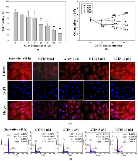 It is known that VSMCs dedifferentiation is connected with enhanced proliferative and migratory capacities []. Previous studies have reported that VSMCs in culture condition quickly fail to the contractile characteristics (contractile phenotype) and actively obtain the proliferating capacity (synthetic phenotype) showing features of less differentiated fibroblast-like cells upon progressive vascular lesions []. To evaluate the phenotype of A7r5 cells in the current culture condition and the impact of GTIN on the phenotypic switch of VSMCs, the expression of a contractile marker (also known as a differentiated marker), F-actin [], was observed by ICC analysis. As presented in Figure 1c, a morphology change of A7r5 cells was short and round with low expression of F-actin upon FBS stimulation, while elongation and spindle with high expression of F-actin in starvation group (0.5% FBS for 48 h). In ICC analysis, the result was also found that GTIN treatments dramatically enhanced the expression of F-actin comparing the untreated control (Figure 1c), representing that GTIN corrected phenotypic switch and promoted the expression of differentiation marker in the FBS-model VSMCs. To further study the possible involvement of GTIN’s anti-proliferation in the modulation of VSMCs cell-cycle, the effects of GTIN (1, 5, and 10 μM) on A7r5 cells were detected by flow cytometry. In concordance with this VSMCs phenotypic transition, comparing with starvation group, a significant induction in the S phase was observed in the FBS-exposed cells, as the positive control in the following experiments. A 48 h-treatment of 5 and 10 μM GTIN resulted in an apparent accumulation of the cells in the G0/G1 phase from 70.77% to 79.66%, an increase of about 12% or more (Figure 1d).
