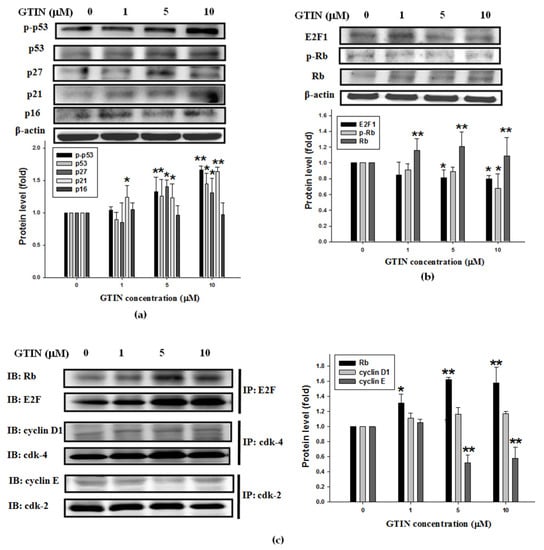 To investigate the underlying mechanisms of GTIN-arrested cell-cycle at G0/G1 phase, at 48 h the indicated doses of GTIN-treated A7r5 cells were subjected to WB analysis. The protein levels of CDKIs, including p27, p21, and p16, and their upstream factor p53 were first analyzed. Among them, p-p53, p53, p27, and p21 levels, not p16, were significantly increased by GTIN treatments at 5 and 10 μM (Figure 2a). In Go/G1 phase, a succession of cyclin/cdk complexes causes Rb hyperphosphorylation, releasing E2F1 from its sequestration together with Rb, and allowing E2F1 to transactivate genes essential for the S phase []. To determine the roles of Rb and E2F1 on the GTIN-blocked G0/G1 phase, the phosphorylated level of Rb and the expression of its complex with E2F1 were elucidated. The data indicated the protein level of Rb was markedly elevated, even though the phosphorylation of Rb was slightly reduced by 1, 5, and 10 μM GTIN treatments. After incubating with GTIN for 48 h, the GTIN treatment also inhibited significantly the protein of E2F1 (Figure 2b). Using IP assay, GTIN treatments induced the formation of Rb/E2F1 complex in A7r5 cells, confirming that an induction in Rb/E2F1 complex was correlated to a decline in the p-Rb level in the cell-cycle. To verify if GTIN induced the up-regulation of cdk inhibitors, contributing to inhibit cyclin/cdks activities, A7r5 cells were treated with GTIN at the indicated doses. As shown in Figure 2c, there was a significant reduction in expression of cyclin E/cdk-2 complex in the GTIN treatments, while no change in cyclin D1/cdk-4 complex. These results concluded that cyclin E/cdk-2 and Rb/E2F1 complexes participated in the GTIN-induced VSMCs cell-cycle arrest at G0/G1 stage.