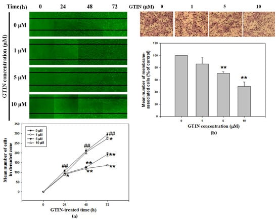 GTIN inhibited wound-healing and cell migration in VSMCs. (a) Monolayers of growth-arrested A7r5 cells treated with GTIN at the indicated doses (0, 1, 5 and 10 μM) were wound, and the cell numbers in the denuded zone were photographed and quantified for 0, 24, 48 and 72 h. The result was showed as mean ± SD of three repeats from at least three independent experiments. ## p < 0.01 compared with the 0-h untreated control via one-way ANOVA with Dunnett’s post-hoc analysis. * p < 0.05, ** p < 0.01 compared with compared with the respective time point of the untreated control via one-way ANOVA with Dunnett’s post-hoc analysis. (b) A7r5 cells were treated with GTIN at the indicated doses (0, 1, 5 and 10 μM) for 48 h. The treated cells were subjected to assay for Transwell migration method. Images of the membrane-associated cells (purple parts) were then analyzed by Giemsa stain. The result was showed as mean ± SD of three repeats from at least three independent experiments. * p < 0.05, ** p < 0.01 compared with the untreated control via one-way ANOVA with Dunnett’s post-hoc analysis.
