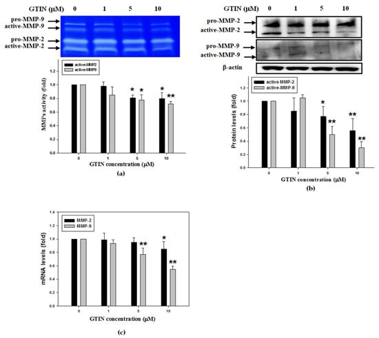 In the above experiments, the inhibitory effect of GTIN on the migratory behavior of VSMCs was demonstrated, but its regulatory mechanism remains unknown. In order to explore the mechanism by which GTIN causes a decrease in cell migration, the activities of MMP-2/9, these factors are critical for the VSMCs migration, were further assayed using gelatin zymography. Figure 4a showed that MMP-2/9 activation was inhibited by GTIN in a concentration-dependent matter. Next, WB analysis indicated the protein levels of active-MMP-2/9 were increased significantly after GTIN treatments, specifically that of MMP-9 (Figure 4b). The GTIN mediated a reduction in the both protein levels, which was well in agreement with their mRNA levels as evidenced by applying qRT-PCR (Figure 4c), representing that GTIN down-regulated the transcriptional levels of MMP-2/9 to affect the expressions.