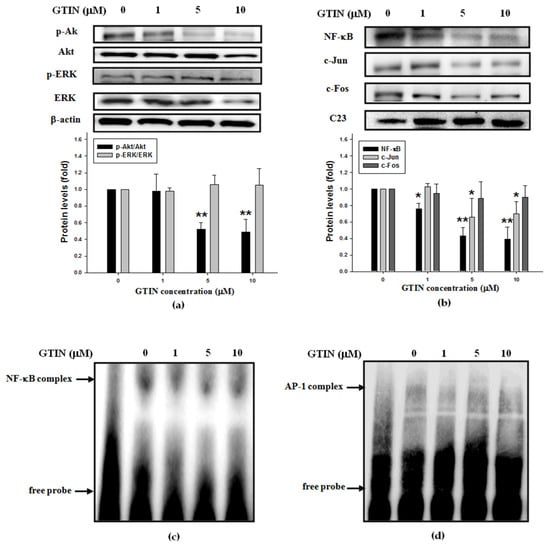The migration of VSMCs has been shown to be regulated not only by the activities of MMP-9 [], but also the up-regulation of Akt or ERK signaling pathway []. As shown in Figure 5a, GTIN reduced notably the phosphorylated level of Akt, but not that of ERK. Previous studies have also reported that promoter region of MMP-9 gene is located at several binding elements of transcription factors, such as NF-κB and AP-1 (a heterodimer of c-Jun and c-Fos), which serve as the downstream factors of Akt [,]. When compared with untreated control, GTIN treatments induced the significant nuclear expressions of the above transcription factors NF-κB p65, c-Jun, and c-Fos in A7r5 cells (Figure 5b). Furthermore, EMSA experiment also revealed that in A7r5 cells incubated with GTIN for 48 h, there were a marked reduction in the DNA-binding ability of the nuclear NF-κB (Figure 5c), and a minor decrease in that of AP-1 (Figure 5d). Therefore, it is possible the inhibitory effect of GTIN on the VSMCs migration was majorly conducted via down-regulating Akt/NF-κB that subsequently caused decreases in the expressions and activity of MMP-9.