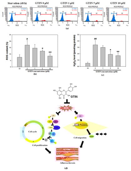One review study has indicated that oxidative stress promotes the activity and expression of MMPs [], and further studies also displayed the MMPs-mediated ECM remodeling is regulated by ROS []. To study the cellular oxidative stress diminished by GTIN in A7r5 cells, the contents of ROS production in different groups were assayed (Figure 6a). Comparing with the starvation group, the examination of cellular ROS levels revealed the FBS stimulation led to an increase in oxidative stress. Such an increase was reduced by the GTIN treatments in a dose-dependent fashion (Figure 6b), suggesting its antioxidant action. Under the same condition, GTIN also had an inhibitory effect on the H2O2 amount, the main kind of ROS, was coincided with the above result of ROS generation (Figure 6c). Taken together, these results suggested in vitro inhibitory effect of GTIN against ROS generation may correct the degree of abnormal VSMCs proliferation and migration by down-regulating Akt/NF-κB signaling-mediated MMP-9 production and up-regulating p53 signaling-mediated Rb phosphorylation that subsequently inhibited the development of atherosclerosis (Figure 6d).