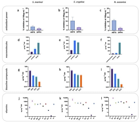 Antioxidant capacity (ABTS and DPPH scavenging ability) of the biomass from S.m. (a), C.c. (b) and N.o. (c); macromolecular composition of the biomass from S.m. (d), C.c. (e) and N.o. (f); bioactive compounds content of the biomass from S.m. (g), C.c. (h) and N.o. (i) and vitamin content of the biomass from S.m. (j), C.c. (k) and N.o. (l) (y axis in log scale). S.m. = Skeletonema marinoi, C.c. = Cyclotella cryptica, N.o.= Nannochloropsis oceanica. TSC = total sterols content, TCC = total carotenoids content, TPC = total polyphenols content, TFC = total flavonoids content. Values are expressed as mean ± SD.