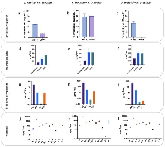 Antioxidant capacity (ABTS and DPPH scavenging ability) of the biomass from S.m. + C.c. (a), C.c. + N.o. (b) and S.m. + N.o. (c); macromolecular composition of the biomass from S.m. + C.c. (d), C.c. + N.o. (e) and S.m. + N.o. (f); bioactive compounds content of the biomass from S.m. + C.c. (g), C.c. + N.o. (h) and S.m. + N.o. (i) and vitamin content of the biomass from S.m. + C.c. (j), C.c. + N.o. (k) and S.m. + N.o. (l) (y axis in log scale). S.m. = Skeletonema marinoi, C.c. = Cyclotella cryptica, N.o. = Nannochloropsis oceanica. TSC = total sterols content, TCC= total carotenoids content, TPC = total polyphenols content, TFC= total flavonoids content. Values are expressed as mean ± SD.