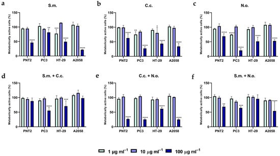 Co-cultivation modified the antiproliferative capacity of the biomass extracts (Figure 3d–f and Figure S3). At the highest concentration, the S.m + C.c. extract enhanced the cytotoxicity on the PC3 cells (55% cell viability, p < 0.0001) (Figure 3d) compared for instance to S.m. in mono-culture (75% cell viability, Figure 3a). Moreover, S.m + C.c. extract did not affect the normal prostate epithelium (PNT2) cell line viability at none of the three concentrations tested (Figure 3d). Regarding the C.c. + N.o. co-cultivation, the highest concentration (100 µg mL−1) of this extract decreased the viability of all cell lines (Figure 3e; p < 0.0001), although no effect was reported with the two other concentrations (1 or 10 µg mL−1, Figure 3e; p > 0.05). S.m. + N.o. extract inhibited the human cell line A2058 viability at a concentration of 100 µg ml−1 (54%, Figure 3f; p < 0.0001), although the antiproliferative effect against the other cell lines was lower compared to S.m. or N.o. extracts from mono-cultivation.