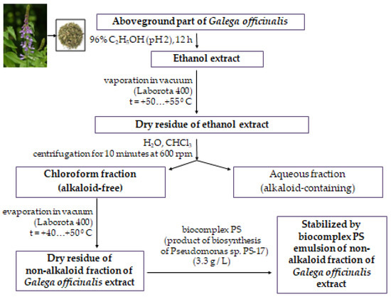 Leaves and stems of Galega officinalis were gathered at the period of flowering. Afterwards, it was dried out on air and fragmented into even pieces. The extract was made by infusion of plant material in 96% ethanol at a ratio of 1:5. Extraction was performed for 12 h at a temperature of 20–23 °C. Subsequently, the ethanol extract was evaporated (in a vacuum at 50–55 °C) using rotary evaporator Laborota 4001 (Heidolph, Schwabach, Germany). The procedure of evaporation was performed until obtaining dense residue extract. The crude extract percentage yield was estimated as 15–17%. To obtaining non-alkaloid fraction of ethanol extract, an equal amount of H2O and CHCl3 was added. The obtained mixture was carefully shacked and then centrifuged (10 min, 600 g). Obtained by such a scheme chloroform part of the ethanol extract was evaporated (in a vacuum at 40–55 °C) until obtaining a solid residue. The chloroform fraction estimated percentage yield was 3.3–5%. For the stabilization of chloroform fraction, biocomplex PS (biosynthesized by Pseudomonas sp. PS-17 surface-active products) was used. To the obtained solid residue of chloroform fraction of Galega officinalis extract, water and biocomplex PS were added at a concentration of 3.3 g/L [18]. All procedures were followed by shaking in Vortex (Biosan, Latvia) (Figure 1).