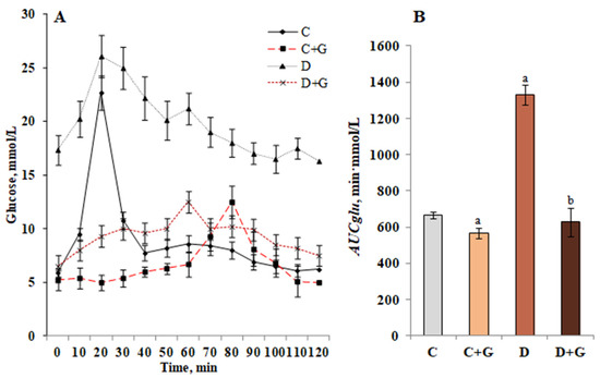 In Figure 3, A is shown the glycemic curves of healthy and diabetic animals to whom Galega officinalis extract was administrated for 14 days. The maximum increase in blood glucose level in animals of the control group (by 282% relative to baseline level) was recorded at 20 min after administration of glucose per os at a dose of 1 g/kg body weight. In animals with DM, the maximum increase in blood glucose concentration (51% relative to baseline level) was recorded at 20 min after a carbohydrate load. Glucose utilization is slower in animals with diabetes compared to control animals. Maintaining a high level of glycemia in the postabsorptive period indicates a decrease in glucose tolerance in animals of this group.