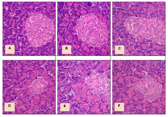 Morphological structure of the pancreas. The arrows show the islets of Langerhans. ((A)—control (C), (B)—C + G (600 mg/kg), (C)—C + G (1200 mg/kg)—a large number of cells in the pancreatic islets; (D)—diabetes (D)—small islet of Langerhans with signs of discomplexation of secretory cells with vacuolation of the cytoplasm, (E)—D + G (600 mg/kg)—dystrophic changes of the islet of Langerhans, (F)—D + G (1200 mg/kg)—increasing the number of secretory cells, reduced degree of dystrophy). Hematoxylin staining with eosin. Magnification 40 × 10.