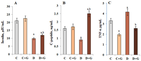 Concentrations of insulin (A), C-peptide (B) in the blood plasma and TNF-α (C) in the pancreas of healthy animals, under the conditions of DM and on the background of Galega officinalis extract administration. a—p < 0.05, as compared with the control group; b—p < 0.05, as compared with the diabetes mellitus group.