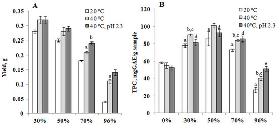 Comparing the efficiency of bioactive compounds extraction by 30, 50, 70, and 96% water–ethanol mixtures, it was found that the highest yield of the extract per 1 g of dry raw material was obtained in the case of using 30 and 50% ethyl alcohol. The extraction efficiency was improved by increasing the temperature to 40 °C and acidifying the medium to pH 2.3 (Figure 6A).