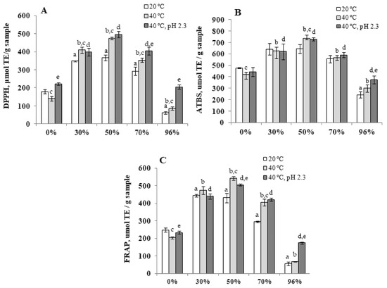 Antioxidant activity (A,B) and iron-reducing ability (C) of water and water-ethanol extracts of yacon leaves. a—Significantly different from the 0% ethanol, 20 °C (p < 0.05); b—significantly different from the 0% ethanol, 40 °C (p < 0.05); c—significantly different from the water-ethanol extracts, 20 °C (p < 0.05); d—significantly different from the 0% ethanol, 40 °C (p < 0.05); e—significantly different from the water-ethanol extracts, 40 °C (p < 0.05).