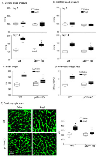 Development of hypertension and cardiac hypertrophy in AngII-infused WT and p47phox KO mice. (A) Systolic blood pressure. (B) Diastolic blood pressure. Day 0: day of minipump implantation. Day 14: day of minipump removal. (C) Heart weights. (D) Heart weight (HW, mg)/body weight (BW, g) ratio. (E) Left panels: Representative images of cardiomyocyte sizes on the cross-sections of left ventricular tissues. The cardiomyocytes membranes were labelled with WGA-FITC (green). Right panel: Statistical analysis of cardiomyocyte cross-sectional areas (µm2). n = 9 mice per group. Statistical analyses were performed using two-way ANOVA. * p < 0.05 for AngII values versus saline values in the same genetic group; † p < 0.05, for p47phox KO AngII values versus WT AngII values.