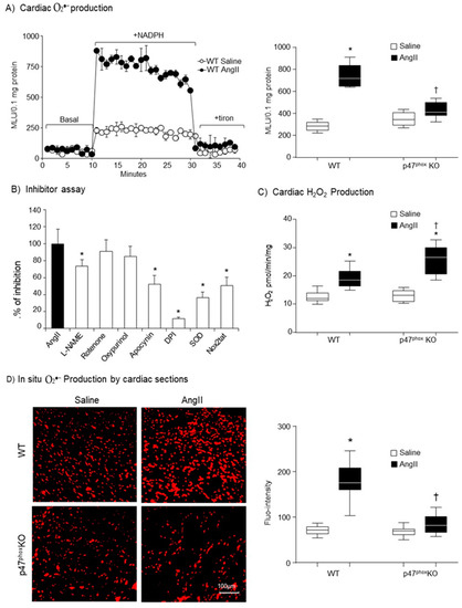 O2●− is not stable and can be quickly converted to H2O2 in cells. Therefore, we examined cardiac H2O2 production using catalase-inhibitable amplex red assay (Figure 2C). There was no significant difference in the basal (without AngII) levels of H2O2 production between WT and p47phox KO hearts. Compared to saline infused controls, the level of H2O2 production was significantly increased in AngII-infused WT hearts, which might link to the high level of O2●− production. However, in the p47phox KO hearts, although the level of O2●− production showed no change in response to AngII challenge, there was a significant increase in the levels of H2O2 production in AngII-infused p47phox KO hearts as compared to saline controls.
