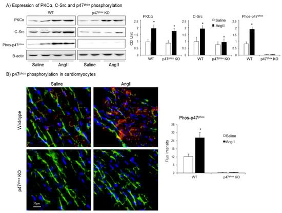 Protein kinase C alpha (PKCα) is highly expressed in the myocardium [22], and phosphorylates p47phox at multiple serine sites in response to AngII stimulation. [23]. C-Src had been proposed to be an upstream tyrosine kinase that phosphorylates p47phox in response to AngII stimulation [24]. Therefore, we examined the levels of expressions of (PKCα) and C-Src together with the levels of p47phox phosphorylation in WT and p47phox KO hearts by immunoblotting (Figure 4A). Compared to saline-infused controls, AngII infusion increased the levels of PKCα expression in both WT and p47phox KO hearts without significant difference between these two groups. However, AngII-induced C-Src expression was only found in WT hearts, but not in p47phox KO hearts suggesting a key role of oxidative stress in cardiac C-Src activation (Figure 4A). Accompanied with increased PKCα expression, there were significant increases in p47phox serine phosphorylation detected using specific antibodies to phos-p47phox.