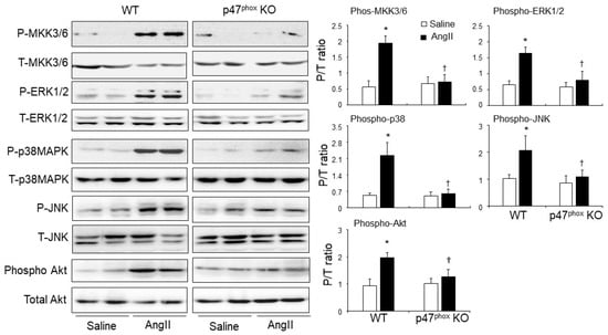 AngII-induced activation of mitogen-activated protein kinase kinase 3/6 (MKK3/6), mitogen-activated protein kinases (i.e., ERK1/2, p38MAPK and JNK) and Akt (also called protein kinase B) in murine hearts. Left panels: Representative immunoblotting images. The total protein bands of each molecule in heart homogenates were pre-tested for equal loading. Right panels: Quantification of the optical densities (OD) of phos-protein bands expressed as phosphorylated/total (P/T) protein ratio. n = 9 mice per group. Data were presented as Mean ± SD. Statistical comparisons were made using two-way ANOVA. * p < 0.05 for AngII values versus saline values in the same genetic group. † p < 0.05 for p47phox KO AngII values versus WT AngII values.