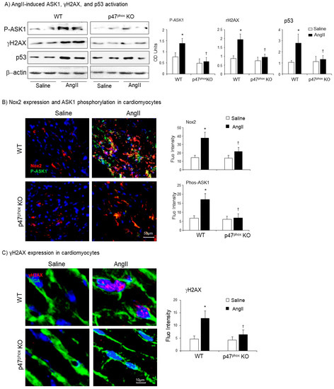Activation of apoptosis signal-regulating kinase 1 (ASK1), p53 and phosphorylation of H2A histone family member X (γH2AX) in murine hearts. (A) Western blots for the expressions of phos-ASK1, p53 and γH2AX. Optical densities of protein bands were quantified and normalised to the levels of β-actin detected in the same samples. (B) Confocal immunofluorescence detection of Nox2 (Cy3 labelled, red) and phos-ASK1 expressions (FITC labelled, green) in the cardiac sections. (C) Confocal immunofluorescence detection of γH2AX expression (Cy3-labelled, red) in the cardiac sections. The cardiomyocyte membrane was labelled by WGA-FITC (green), and the nuclei were labelled by DAPI (blue). The specific fluorescent densities were quantified. n = 9 mice per group. Data were presented as Mean ± SD. Statistical comparisons were made using two-way ANOVA. * p < 0.05, for AngII values versus saline values in the same genetic group. † p < 0.05 for p47phox KO AngII values versus WT AngII values.