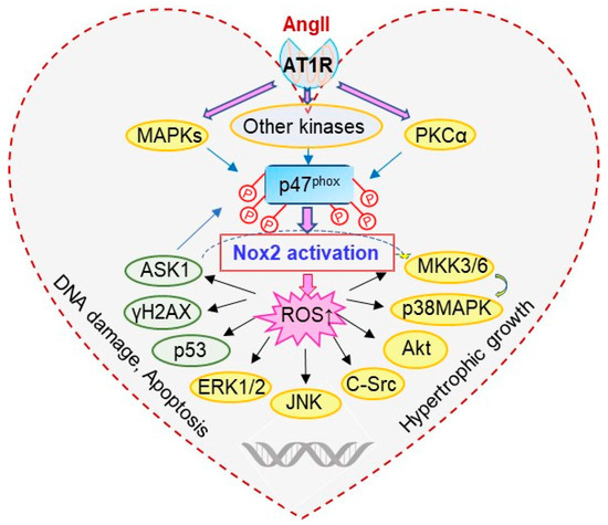 In the mammalian heart, the p47phox is expressed in the myocardium, epicardium and coronary vessels [1]. In cardiomyocytes p47phox had been reported to co-localise with F-actin and cortactin in order to facilitate the translocation of the cytosolic regulatory subunits to the p22phox/Nox2 complex [8,9]. Under pathological conditions, p47phox was suggested to link oxidative stress with the hypertrophic growth of cardiomyocytes through the activation of mitogen-activated protein kinases (MAPKs), i.e., extracellular signal-regulated kinase (ERK), c-Jun N-terminal kinase (JNK) and p38 mitogen-activated protein kinase (p38MAPK) [10,11]. In response to oxidative stress, the redox-sensitive MAPK kinase (MKK) to MAPKs signalling pathways are activated, which in turn promote the activities of pro-apoptotic signalling molecules such as p53, γH2AX and apoptosis signal-regulating kinase 1 (ASK1) leading to cardiac damage [12,13,14]. Genetic ablation of p47phox attenuated AngII-induced abdominal aortic aneurysm formation in apolipoprotein E-deficient mice [15], and reduced the level of cardiac hypertrophy after experimental myocardial infarction [16].