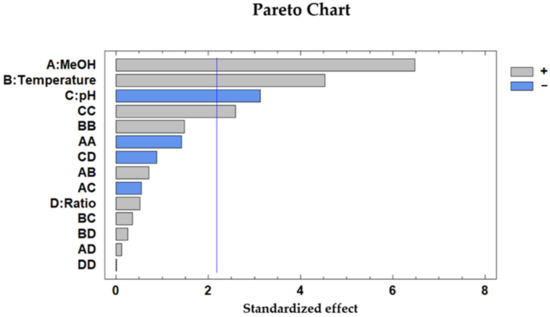 In order to determine the influence from each variable, a Pareto chart was elaborated (Figure 1), and a positive correlation with the percentage of solvent (methanol), the temperature and the quadratic interaction of the solvent pH was observed, while solvent pH had a negative effect on the recovery of the anthocyanins.