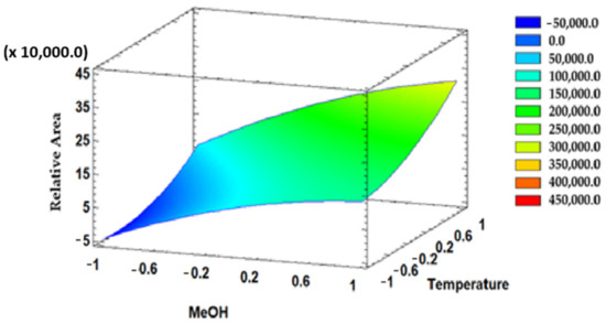 Surface response diagram representing the effect of temperature and percentage of methanol in the solvent with respect to the relative area of the anthocyanins extracted.