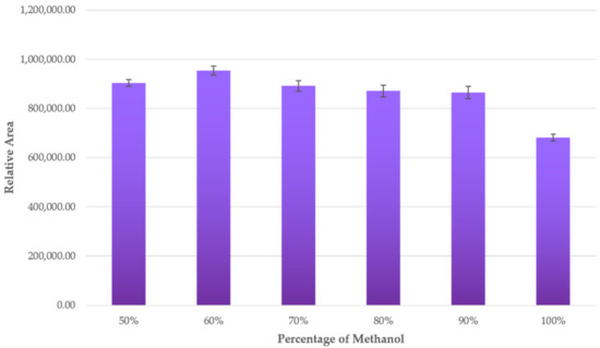 Anthocyanins’ relative area according to different methanol percentages in the extraction solvent (n = 3).